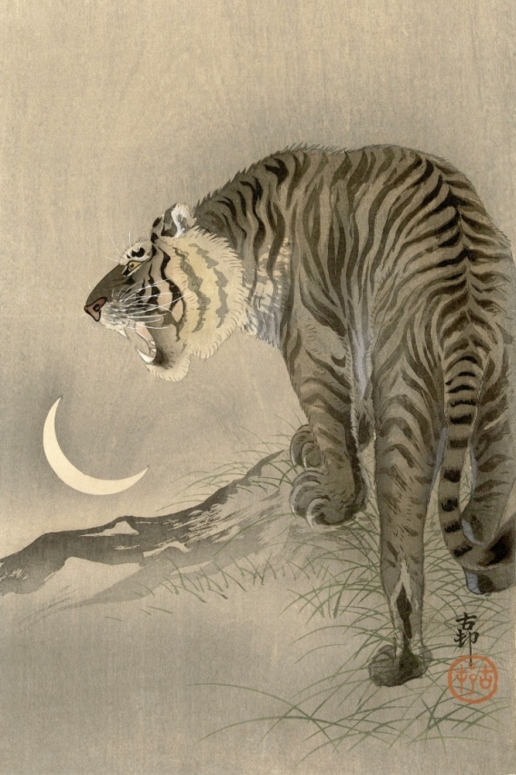 Tygrys nie jest zwierzęciem rodzimym dla Japonii – na archipelag trafił jako motyw artystyczny z kontynentu, przez Koreę i Chiny, głównie za sprawą buddyzmu i malarstwa zen. W japońskiej kosmologii tygrys symbolizuje siłę wiatru i odwagę; jego ryk, według tradycji, jest inkarnacją grzmotu. Zestawienie z księżycem nie jest przypadkowe – tygrys i księżyc to klasyczna para, yin i yang, siła ziemska i niebiańska łagodność. Koson wpisuje się tu w długą tradycję malarzy od Sesshū po Maruyamę Ōkyo, ale robi to po swojemu – z oszczędnością formy bliską plakatowi i z tą samą czułością wobec zwierzęcia, z jaką traktuje czaple i zimorodki.