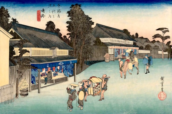 Historycznie Narumi-juku było stacją w rejonie dzisiejszego Nagoi, a jej sława splatała się z rozkwitem Arimatsu shibori (z pobliskiego Arimatsu) — techniki barwienia przez wiązanie i zaciskanie tkaniny, która stała się lokalną specjalnością i przemysłem nastawionym na ruch na głównej arterii kraju. W praktyce Tōkaidō było tu idealnym kanałem dystrybucji: podróżni kupowali tkaniny jako użyteczne przedmioty i pamiątki, a stacja żyła nie tylko noclegiem, lecz handlem miejscowym wyrobem. Hiroshige streszcza to bez zbędnych ozdobników: jedna lektyka i dwa sklepy wystarczą, żeby Narumi zapamiętać jako punkt, w którym droga zamienia się w rynek.