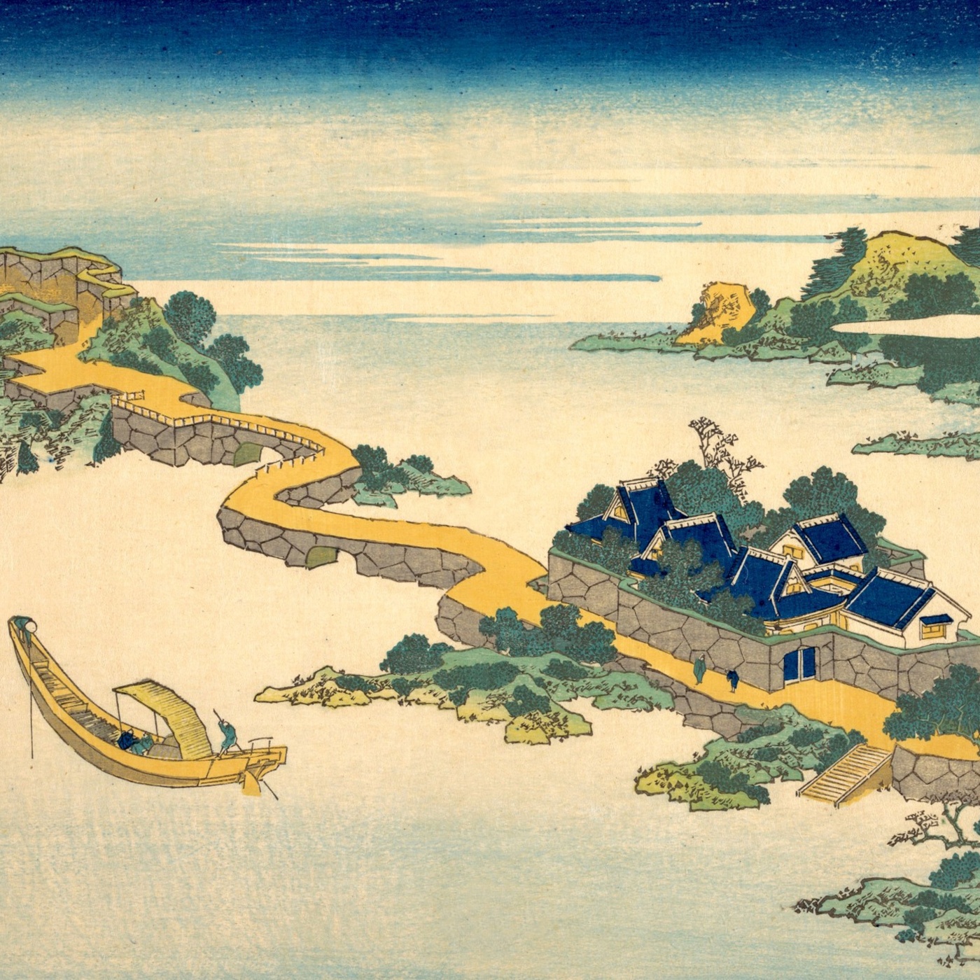 Seria „Ryūkyū hakkei” (琉球八景, „Osiem widoków Wysp Ryukyu") należy do ośmiu wielkich cykli pejzażowych Hokusaia i jest wśród nich dziełem bodaj najbardziej osobliwym. Artysta sięgnął po formułę hakkei — „ośmiu widoków" — zakorzenioną w chińskiej tradycji malarstwa krajobrazowego, wywodzącą się od „Ośmiu widoków Xiao i Xiang” i przeniesioną do Japonii jako konwencja z ustalonymi nastrojami: nocny księżyc, wieczorny dzwon, powracające żagle, jesienna pogoda po deszczu. Tyle że Hokusai, wierny tym nastrojom co do litery, wypełnił je krajobrazem wyobrażonym. Na subtropikalne Ryukyu położył śnieg. W tle wysp, gdzie najwyższy szczyt nie przekracza pięciuset metrów, umieścił górę o sylwetce przypominającej Fuji. Do kompozycji, których źródłowy pierwowzór był statyczny i pozbawiony ludzi, dodał łodzie, postacie w chińskich szatach, żaglowce z ozdobnymi dziobami. Efektem nie jest fałszerstwo, lecz swoista poetyka odległości — obraz miejsca, które istnieje na granicy faktu i marzenia.